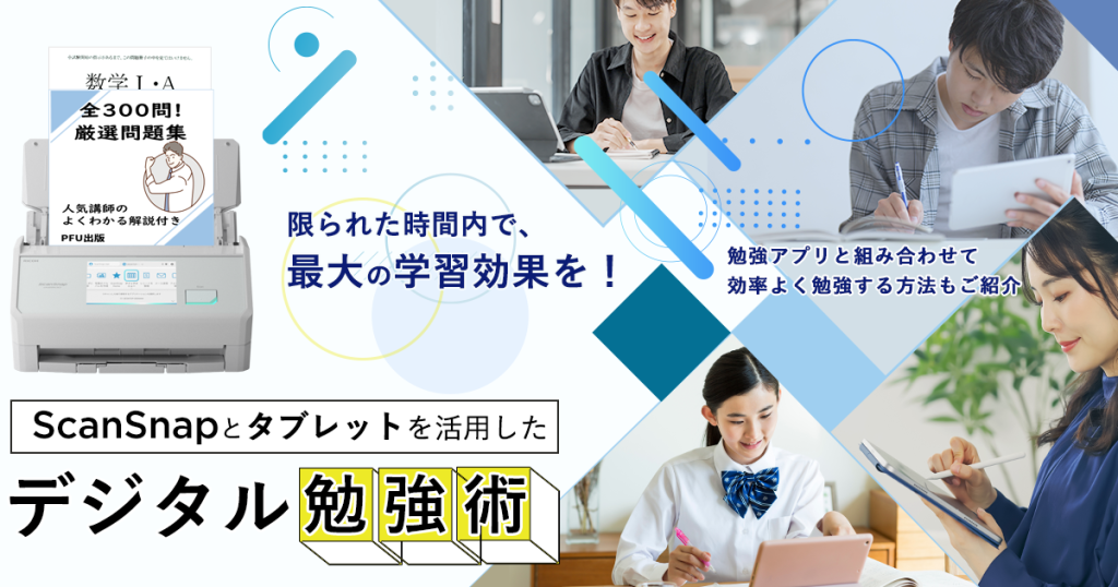ScanSnapを使えば、集中して勉強したい箇所だけ、テスト範囲だけをデータ化して、スマホやタブレットで持ち運びが可能です。